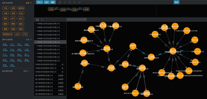 知识推理是知识图谱的终极目标,基于过去已知知识进行知识推理,采用如事件驱动传导路径等进行知识发现,能够在业务的推理和辅助决策上也能带来一定帮助,如智能投研中的未知风险预警、公司舆论控制等,如图19展示了我们目前开发形成的事件驱动工具,通过人工自定义构造传导链,进行既定模式检索,可以完成对既定知识逻辑路线的发现与探索。