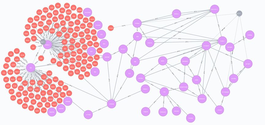 产业链知识图谱,目标是构建起全行的上下行业图谱,行业之间的上下游关系,行业中个大元素之间的关系,例如行业下产品、公司之间的关联等等。为了保证产业链中数据的准确性,我们通过行业研究员人工定义本体,耗时半年时间,构建起了全行业11个主流产业链知识图谱,主要包括246个行业、上万个商品品种,几千家上市公司,共计几百万条关系边的产业链知识图谱,如下图2所示: