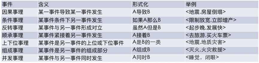 因果事理描述的是认知体系中的一种前因后果联系,前面一个事件会导致后面一事件的发生;条件事理描述的是认知体系中的一种条件结果关系,是一种预设与结果逻辑;反转事理往往描述的是认知体系中的一种互斥逻辑,是一种真假值逻辑;顺承事理描述的认知体系中的一种时间上的偏序关系,是一种先后动作逻辑;组成事理,刻画的是事件之间整体与部分的逻辑;上下位事理,描述的是事件在分类体系中一种逻辑;并发事理,描述的是事件在时间上的一种共生关系,指一个事件发生下另一个事件一定发生;