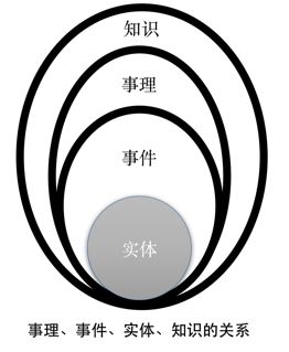 举例来说,如图4所示,我们在思考的过程当中,脑海里经常会比如“为什么”,“按以往的经验”、“八成会”、“据我分析”、“这个应该是”、“怎么可能”等词,这些词很形象的表现表示出了我们思考的过程,我们将思考的过程,定义为运用“事理”的过程,所谓“事理”,就是“事情”的道理,是思考的那条路径,这个“事情”就是我们所需要的事件。对于事理,我们可以有多种理解,事理是一套经验总结,是一套对知识的规则,是一套逻辑推理的方法论,是对特定环境下知识在时空域上的展开。图5展示了知识、事件、实体、事理之间的关系,事件高于实体,实体是事件的组成部分,事件是事理的重要组成部分,事理和实体共同组成了知识。
