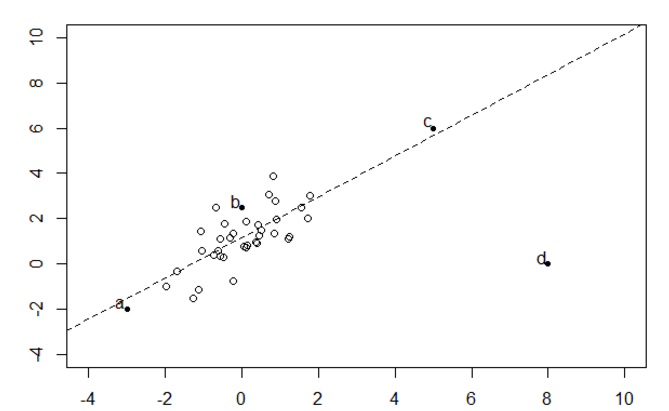 参考如下数据集,移除哪一个黑点将会对回归拟合线(黑虚线所示)产生最大影响