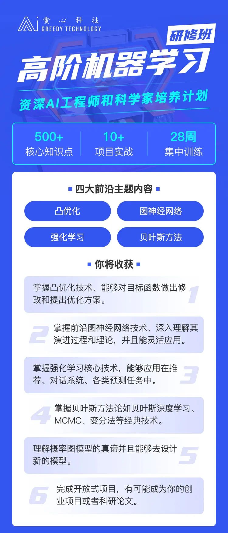 如果你准备发AI方向的论文,或准备从事科研工作或已在企业中担任AI算法岗的工作。那么我真诚的向大家推荐,贪心学院《高阶机器学习研修班》,目前全网上应该找不到类似体系化的课程。课程精选了四大主题进行深入的剖析讲解,四个模块分别为凸优化、图神经网络、强化学习、贝叶斯深度学习。