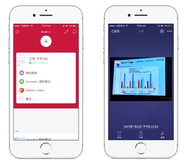 对比 Scanbot,不仅云存储种类比 Scanner 多,还支持协作应用 Slack 以及任务管理应用 Wunderlist 和 Todoist。对这两者的支持可以说进一步提高了 Scanbot 使用效率。扫描文档中需要进一步处理的内容可以直接发给 Todoist 创建任务,扫描文档作为附件,处理任务时省去了查找的麻烦。