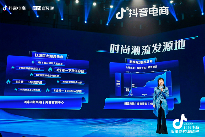 2022年9月20日,抖音电商服饰新风潮盛典在杭州举行。和以往不同的是,抖音电商服饰行业的这次盛典,除了讨论重点议题的峰会,还举办了一场秋冬上新趋势大秀。“无性别风潮”、“运动闲适潮”、“优雅极简潮”、“顶流华风潮”、“复古未来潮”五大秋冬流行趋势,通过超30家知名品牌和新锐设计师品牌的近百套total look展现出来,呈现了一场与近期国内外时装大秀的同一水准的大秀。所有秀款都是秋冬上新趋势款,在现场直播中大部分都可即秀即买。