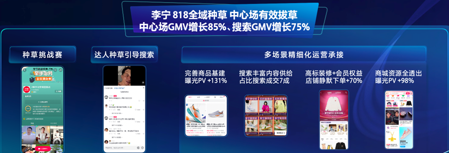运动品牌李宁对此已有所体会。刚过去不久的818好物节中,李宁参与了商城甄选品牌的IP活动,通过达人矩阵大量种草,又通过直播和短视频引导用户主动搜索,使其产品关键词的搜索热度飙升,商城及搜索GMV 分别大幅提升85%、75%,静默下单,也就是不由运营动作直接促成的、用户自发主动的下单,增长70%。