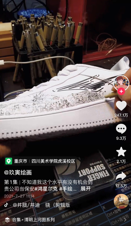 一个离我们更近的例子是,鸿星尔克通过抖音直播售卖一款小白鞋,用户“玖寅绘画”买到之后,出于自己的兴趣在鞋身上手绘“清明上河图”,并且把设计过程上传抖音。最终这支视频收获了将近250万个点赞,鸿星尔克立即联系创作者购买了版权并批量生产,上线后很快销售一空。整个过程不过一个月出头。