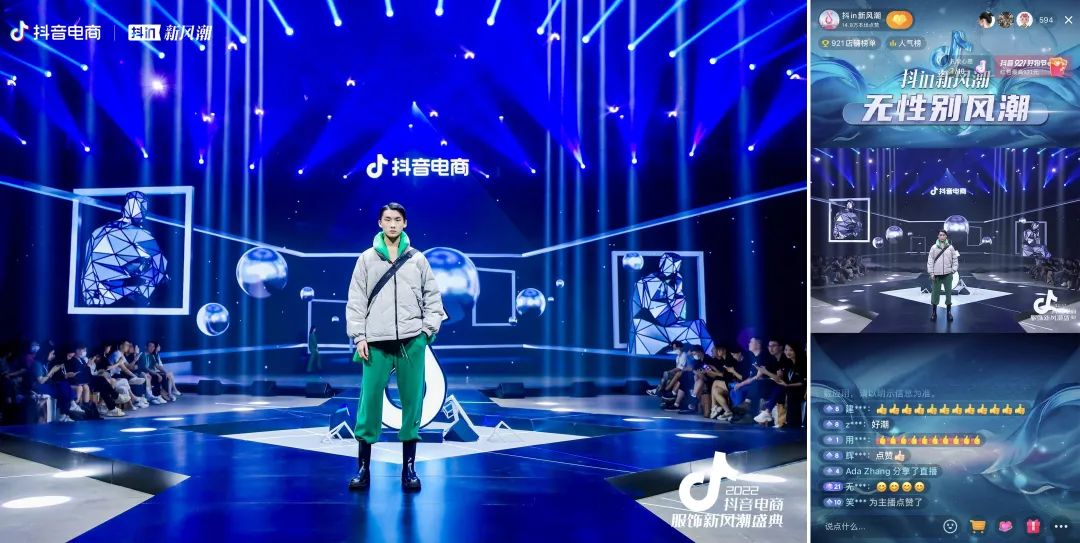 用户通过抖音直播间云看秀,可以实时赞美或吐槽,看中了哪个新品可以立刻下单,参与感大大提升,还感受了一把前排即看秀即逛买的新潮体验。可以说,这次秋冬趋势上新大秀和921好物节,是一次典型的全场域协同showcase。