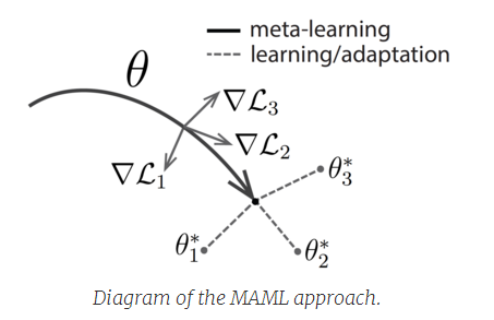 元学习器试图找到一个初始值,不仅可以适应各种问题,而且可以快速(只需少量步骤)高效(只使用几个例子)地适应。下面是一个可视化图–假设我们正试图寻找一组具有高度适应性的参数θ,在元学习过程中(粗线),MAML优化一组参数,以便当执行关于某个任务i(灰线)的梯度步骤时,参数接近i任务的最优参数θi*。