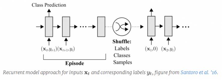 有一些做法可以训练出一个循环模型,例如LSTM网络,先是连续地接收数据集,然后处理来自目标任务的输入。对于图像识别来说,可能需要持续把数据集中成对的图像—标签对传递给网络,然后再传递要识别的新样例。