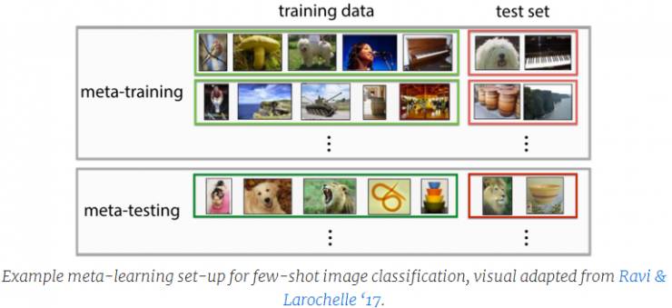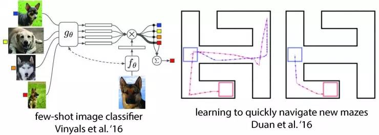 先是让系统接触大量的任务进行训练,然后再测试这个系统学习新任务的能力。比如会有这样的任务:要识别一张新图像是五个分类中的哪一个,每个分类只有一张示例图像;或学会在一次遍历之后高效的走出迷宫。这与许多标准的机器学习技术不同,它们的方法是在单个任务上进行训练,在任务中单独留出的样例中进行测试。