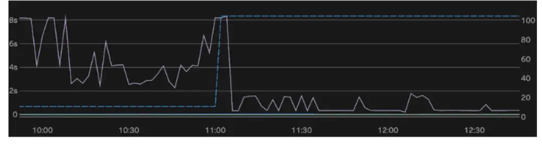 这个集群有一个相对较小的数据集,但负载较重。左轴(浅紫色)是第 99 个百分点的延迟,而右轴(蓝色虚线)是 Locality。在这次事件中 ,Locality 约为 10%,延迟在 2~8 秒之间。利用我们将在本文讨论的工具,我们在 11 点左右解决了这个问题——在短短几分钟内,我们就将 Locality 提高到 100%,并使延迟减少到不足 1 秒。