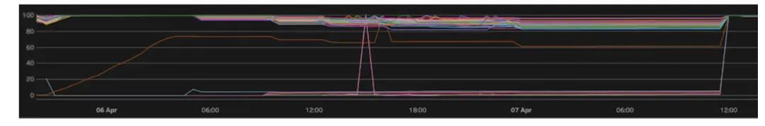 这张图显示了与上面相同的时间段,你可以看到我们曾经有数百个服务器在任何特定时刻都低于 80% 的 Locality。从 5 月初开始,这个数值一直为 0,并保持到今天。