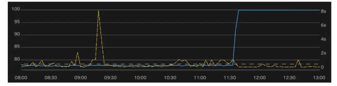 在本例下,我通过绘制单个平均位置(左轴,蓝线)来总结第一个图表。我把集群的第 99 个百分点的延迟叠加在一起(右轴,黄线)。在整个上午,我们看到了越来越多的超时(500 毫秒,用灰色虚线表示)。我们知道,当我们达到流量高峰时,这将变得非常关键,所以在 11:30 运行了 LocalityHealer。Locality 跃升至 100% 后,立即减少了延迟波动和超时的情况。