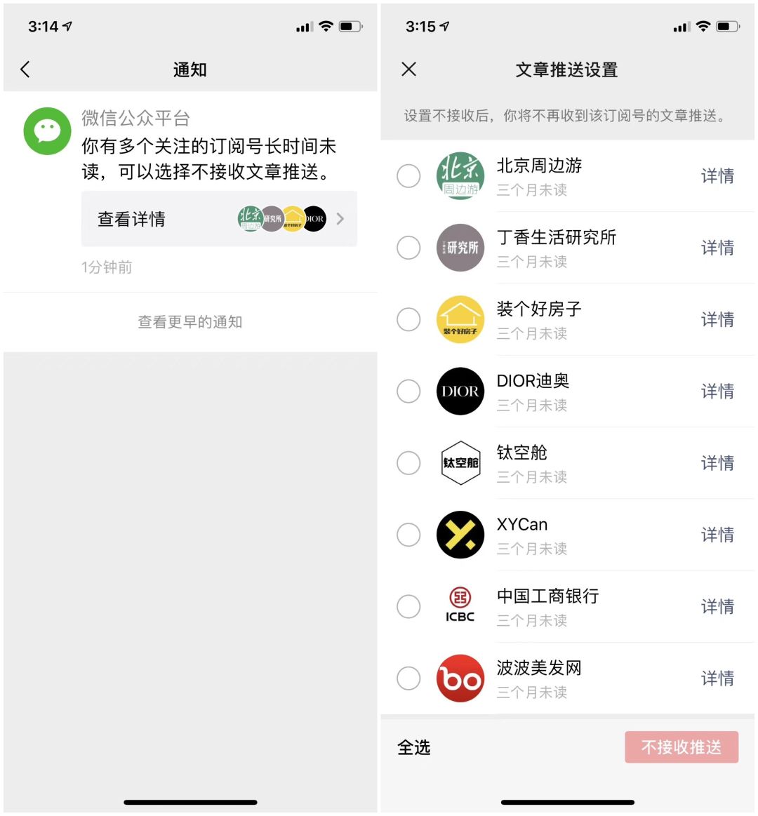 ——“你有多个关注的订阅号长时间未读,可以选择不接收文章推送”。