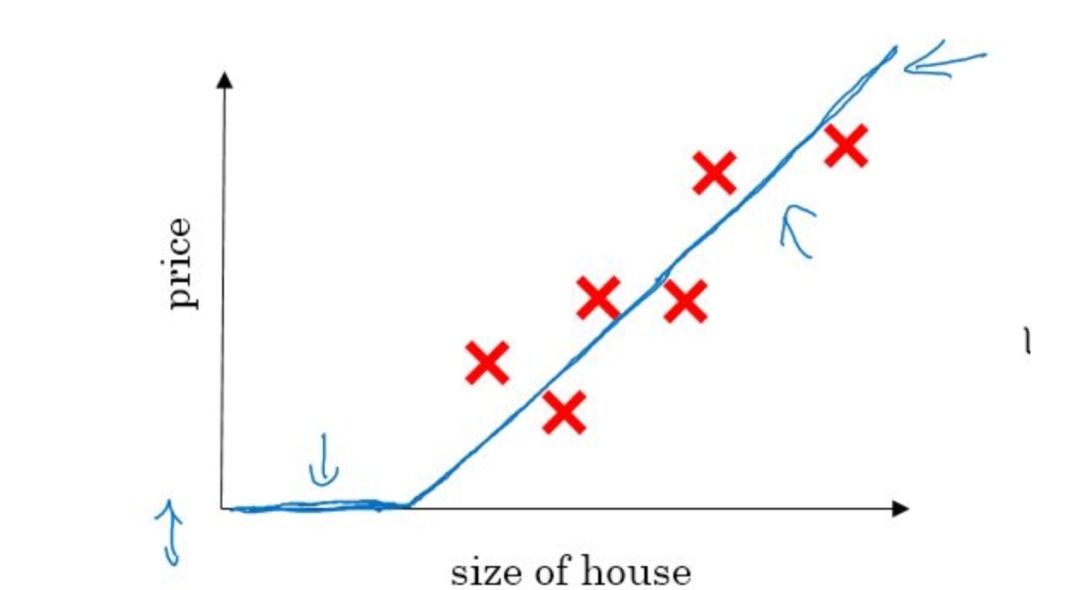 对数据进行线性拟合,且房价永远不会是负数,得到图中的ReLU函数(Rectified Linear Unit,修正线性单元)。