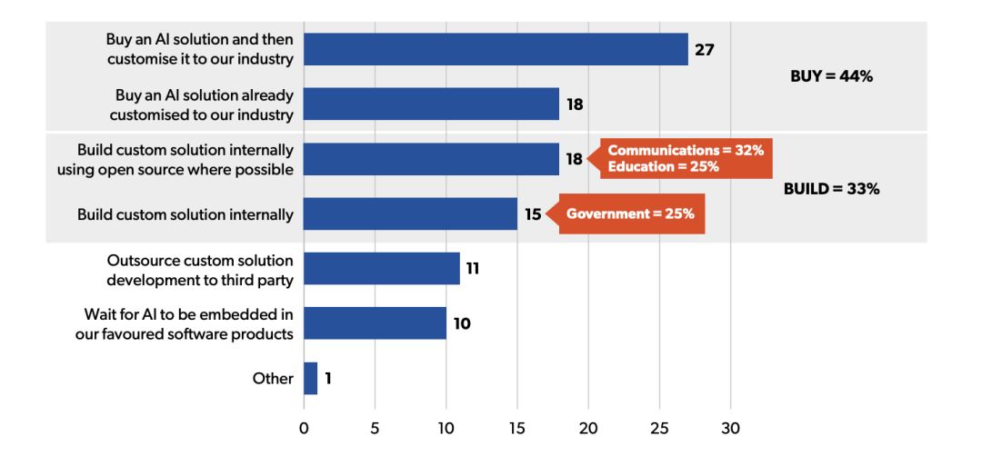 AI人才也成为企业转型的关键,近一半的公司倾向于从第三方购买人工智能解决方案,而1/3的公司则愿意在内部建立人工智能解决方案。只有1/10的公司愿意等待适用于他们的AI产品出现。随着人工智能的发展,企业的关注点也从利用AI提高收入转向降低成本。
