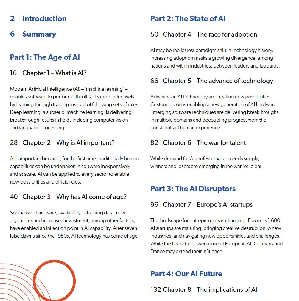这份报告由巴克莱银行赞助,MMC的风险投资机构撰写,报告一共有99页,总体分为4个部分,包括:人工智能发展史、人工智能的发展现状、人工智能革新者、以及人工智能的未来。