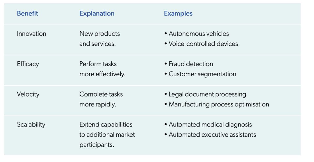 人工智能的基本特征可概括为四点, 创新(新产品和服务)、效能(更有效地执行任务)、速度(更快地完成任务)、和可伸缩性(不受人类能力的限制)。