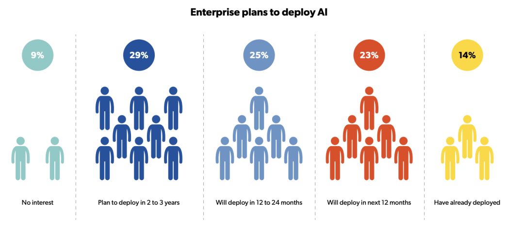 AI采用量在12个月内增加了两倍,有1/7的大公司布局了AI。两年内,会有2/3的大公司将会实施AI计划。