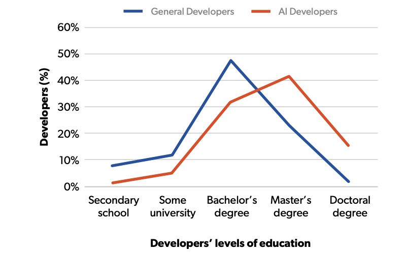 AI人才需有较高的数学, 统计和编程能力, 拥有博士学位的AI开发者要比其他开发人员的程度高。