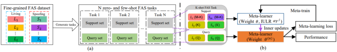 这篇文章将 FAS 做为一个 Zero-shot 和 Few-shot 的学习问题。本文的主要贡献有: 1. 首先将 FAS 定义为一个 zero- and few-shot 的问题。 2. 为了解决 zero- and few-shot FAS 问题,提出一种新的基于元学习的方法:自适应内更新元面孔反欺骗(AIM-FAS) 3. 我们提出了三个新颖的 zero- and few-shot FAS 基准点,以验证 AIM-FAS 的有效性。 4. 进行了全面的实验,以表明 AIM-FAS 在零和几乎没有反欺骗基准。 Zero-shot learning 旨在学习一般的区别特征,这些特征对可以从已知的假脸中检测未知的新假脸。Few-shot learning 旨在快速适应反欺骗模式,通过学习预先定义的假脸和收集到的少量新攻击的样本。 具体来说,在 zero- or few-shot FAS 任务,meta-learner 的一次训练迭代包括两个阶段。元学习者使用 supper set 更新其权重,然后在 query set 上测试更新后的元学习者,得到元学习者的学习成绩和损失。最后,我们用元学习优化元学习者损失。