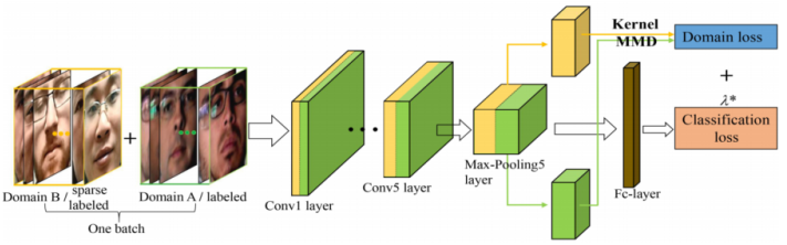 如上图所示,其中每个 batch 包含一半源图像和一半目标图像,最后一个池层输出的两个域的特征用于计算分布距离,计算使用 kernel based MMD,最后的损失函数是分类损失和 domain 损失组成组成。
