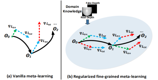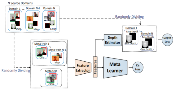 如果我们将现有的元学习算法直接应用于人脸反欺骗任务,会由于以下两个问题而降低性能: 1. 人脸反欺骗模型仅具有二进制类监督,会出现泛化效果差。如下图(a)所示,如果仅在二元类别标签的监督下,将常见的元学习算法应用于面部反欺骗,则 meta train 和 meta test 的学习方向将是有偏见的,这使得 meta learning 难以训练并最终找到广义的学习方向。