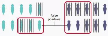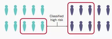 该算法满足预测性平价(无论黑人和白人被告是否有相同的风险评分总体准确率),但是仍然存在一个问题。在蓝色组中,7 人中有 1 人(14%)被误认为是高危人群,而在紫色组中,4 人中有 2 人(50%)被误认为高危人群。因此,紫色个体更有可能成为「假正例」——被误认为高风险。