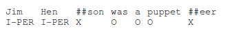 为了微调,我们将最后一层每个单词的隐藏表示 Ti∈RHTi∈RH 送入一个在 NER 标签集合的分类层。每个单词的分类不以周围预测为条件(换句话说,没有自回归和没有 CRF)。为了与词块(WordPiece)序列化相适应,我们把 CoNLI-序列化的(CoNLL-tokenized)的输入词输入我们的 WordPiece 序列化器,然后使用这些隐藏状态相对应的第一个块而不用预测标记为 X的块。例如: