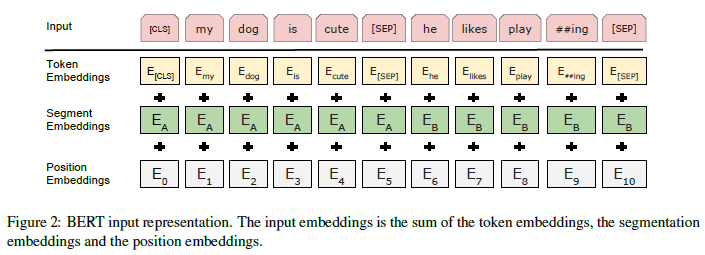 图 2:BERT 的输入表示。输入嵌入是标记嵌入(词嵌入)、句子嵌入和位置嵌入的总和。