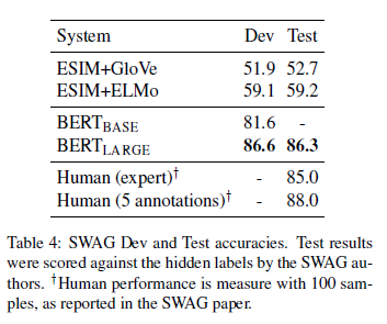 表 4:SWAG 验证集和测试集准确率。测试结果由 SWAG 作者对隐藏的标签进行评分。人类的表现是用 100 个样本来衡量的,正如 SWAG 论文中描述的那样。