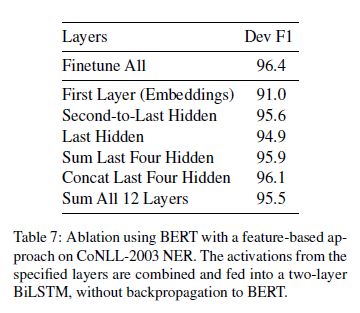 表 7:在 CoNLL-2003 命名实体识别上使用基于特征的方法,并调整 BERT 层数。来自指定层的激活输出被组合起来,并被送到一个两层的 BiLSTM 中,而不需要反向传播到 BERT。