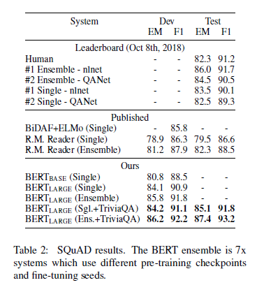 表 2:SQuAD 结果。Ensemble BERT 是使用不同的预训练模型检查点和微调种子的 7x 模型。
