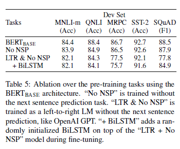 结果如表 5 所示。我们首先分析了 NSP 任务所带来的影响。我们可以看到去除 NSP 对 QNLI、MNLI 和 SQuAD 的表现造成了显著的伤害。这些结果表明,我们的预训练方法对于获得先前提出的强有力的实证结果是至关重要的。