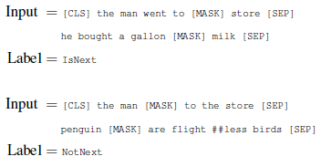 许多重要的下游任务,如问题回答(QA)和自然语言推理(NLI),都是建立在理解两个文本句子之间的关系的基础上的,而这并不是语言建模直接捕捉到的。为了训练一个理解句子关系的模型,我们预训练了一个下一句预测的二元分类任务,这个任务可以从任何单语语料库中简单地归纳出来。具体来说,在为每个训练前的例子选择句子 A 和 B 时,50% 的情况下 B 是真的在 A 后面的下一个句子,50% 的情况下是来自语料库的随机句子。比如说: