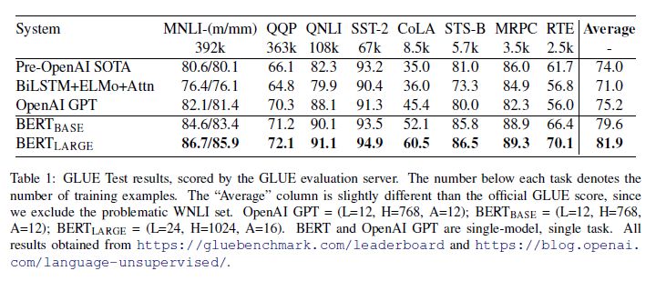表 1:GLUE 测试结果,由 GLUE 评估服务器评分。每个任务下面的数字表示训练示例的数量。“Average”列与官方 GLUE 评分略有不同,因为我们排除了有问题的 WNLI 数据集。OpenAI GPT = (L=12, H=768, A=12); BERTBASE = (L=12, H=768, A=12); BERTLARGE = (L=24, H=1024, A=16)。BERT 和 OpenAI GPT 都是单模型,单任务。所有结果可以从 https://gluebenchmark.com/leaderboard 和 https://blog.openai.com/language-unsupervised/ 获得。