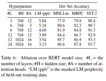 表 6:调整 BERT 的模型大小。#L = 层数;#H = 隐藏维度大小;#A = 注意力头的个数。“LM (ppl)”表示遮蔽语言模型在预留训练数据上的困惑度。