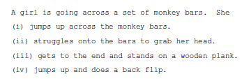 给出一个来自视频字幕数据集的句子,任务是在四个选项中选择最合理的延续。例如: