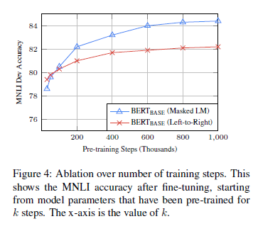 图 4:调整模型的训练步数。图中展示了已经预训练了 k 步后的模型参数在 MNLI 数据集上的再经过微调后的准确率。x 轴的值就是 k。