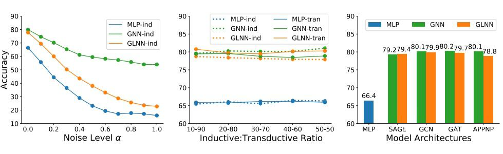 我们通过在节点特征(node features)中加入不同程度的高斯噪声以减少其与标签的相关性。我们用 表示添加噪声的程度。实验结果如图 4-左图所示,随着 的增加,MLP 和 GLNN 的性能比 GNN 下降得更快。当 较小时,GLNN 和 GNN 的性能仍然相当。