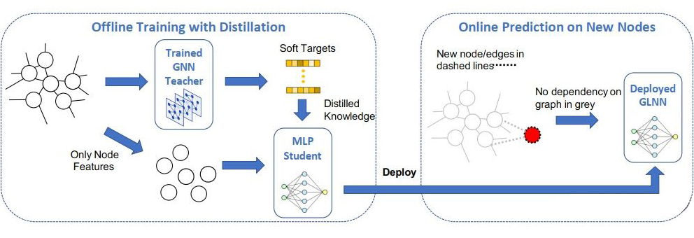 为了结合 GNN 和 MLP 的优点来搭建一个高准确率且低延迟的模型,这篇文章提出了一个模型叫做 Graph-less Neural Network(GLNN)。具体来说,GLNN 是一种涉及从教师 GNN 到学生 MLP 的知识蒸馏(knowledge distillation)模型。经过训练后的学生 MLP 即为最终的 GLNN,所以 GLNN 在训练中享有图拓扑结构(graph topology)的好处,但在推理中没有图依赖性(graph dependency)。