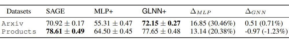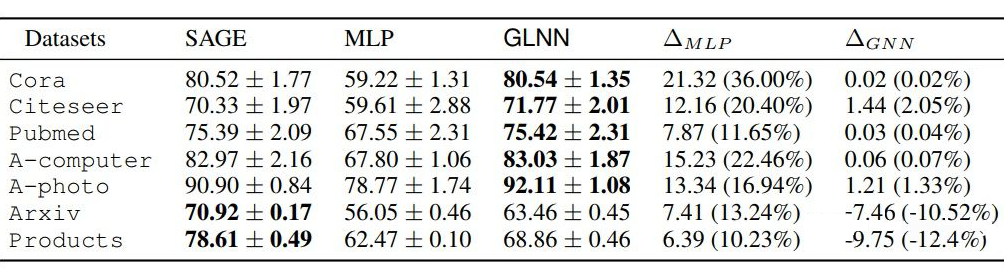 由于 GLNN 的模型非常简单,所以实验部分是这篇文章的重点,从各个角度证明并阐述了 GLNN 的有效性且有效的原因。实验部分主要是回答如下 6 个问题