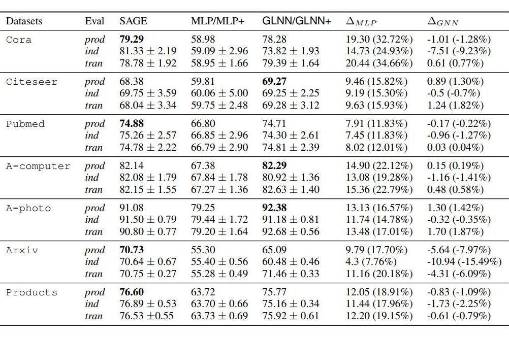 在表 3 中,我们可以看到 GLNN 在归纳设置(inductive setting)下的性能仍能比 MLP 提升许多。在 6/7 个数据集上,GLNN 的性能可以和 GNNs 的接近。在大规模的 Arxiv 数据集上,GLNN 的性能明显低于 GNNs,文章中给出的原因是 Arxiv 数据集的数据分割(data split)比较特殊,会导致测试节点和训练节点之间的分布转移(distribution shift),从而使 GLNN 很难通过 KD 学习到邻居信息。