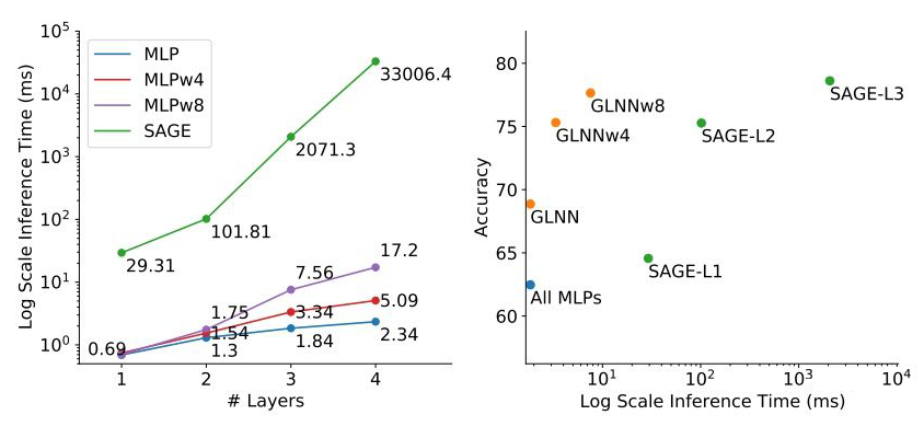 由图 3(右图)所示,一方面逐渐增加 GLNN 的层数可以使其性能接近于 SAGE。另一方面,当 SAGE 的层数减少时,准确率会迅速下降到比 GLNNs 更差。