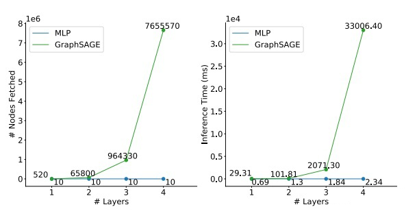 图 1 展示了 GNNs 随着层数的增加所需的邻居节点个数和推理时间呈指数级上升。反观 MLP,在相同的层数下,MLP 的推理时间会少很多,且只是线性增长。这一推理时间的差距可以解释 MLP 比 GNN 在业界用的更广泛的原因。