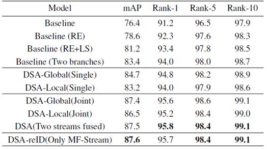 为了验证DSA-reID模型的有效性,我们对其进行了相关的消融实验和对比实验。