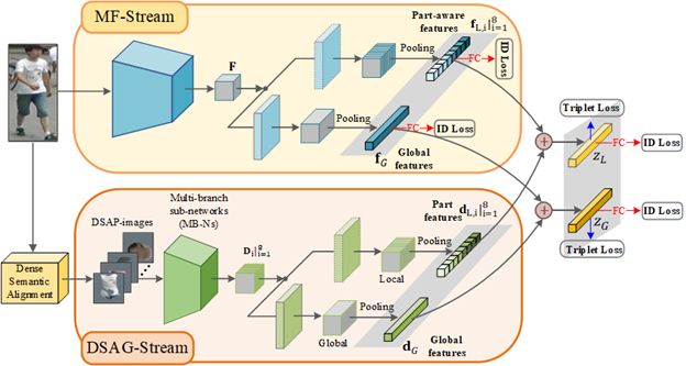 我们通过两路联合学习框架,学习密集语义对齐的全局和局部行人特征表达。