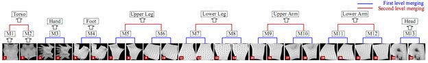 我们对整个网络进行端到端的训练。具体来说,MF-Stream采用基于ResNet-50改进的网络结构作为backbone网络进行特征提取,并在末端使用两分支网络分别提取行人的全局特征表达和局部特征表达;DSAG-Stream采用组卷积分别处理特定语义部件图像。DSAG-Stream在特征提取的过程中进行了两个阶段特征融合(如图4示意图的方式),从而得到对应8个具有特定语义的局部特征表达,分别对应“躯干”、“手”、“脚”、“腿(上)”、“腿(下)”、“胳膊(上)”、“胳膊(下)”和“头”。
