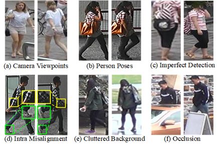 上述的众多实际问题均会导致图像间语义在空间上的不对齐,即对两个要匹配的图片,相同的空间位置对应的内容的语义(Semantics)不同,从而制约了行人重识别技术的鲁棒性和有效性。例如图1(c)中,图像顶部在第一个图片中对应的是肩膀,而第二个图片相应空间位置对应的是头,使得空间上语义不对齐(misalignment)。