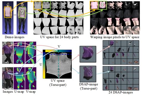 针对行人图像,我们先利用密集语义估计技术(DesnePose)进行像素级别的细粒度语义估计,从而得到各个像素的语义信息。不同于仅有有限节点数的骨架估计,密集语义可以对人体3D表面上的每一个位置赋予一个不同的语义,并通过(u,v)两维坐标值来表达其语义。相应地,根据(u,v)坐标值,人体3D表面上的每个语义(u,v)位置对应的纹理可被映射到UV空间上。该参数化表达方式也常见于图形学中,例如用于对人体纹理信息的存储。
